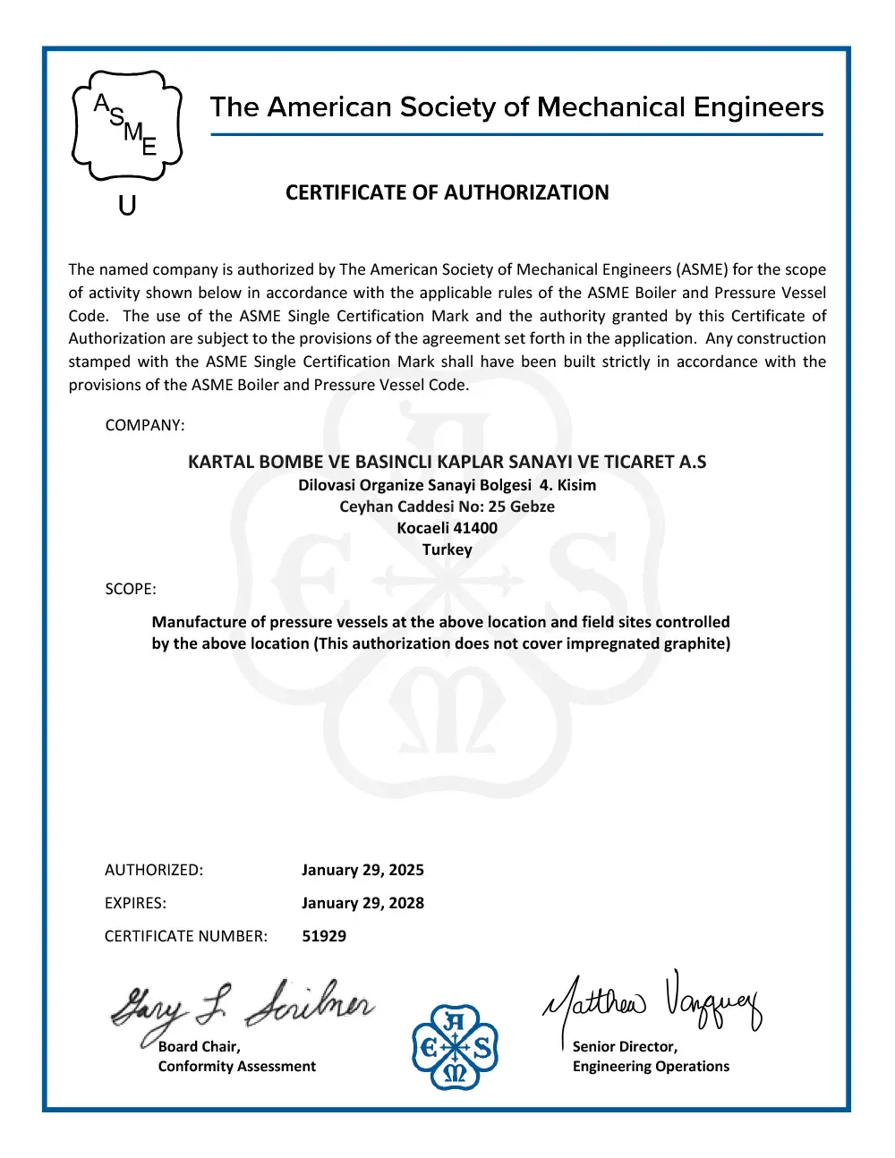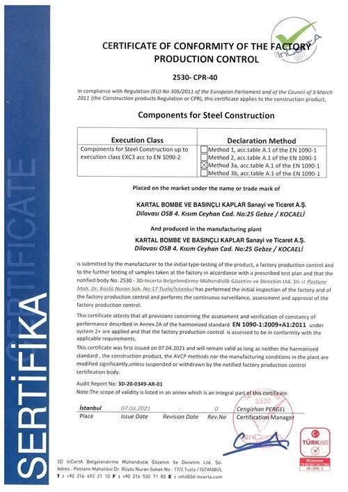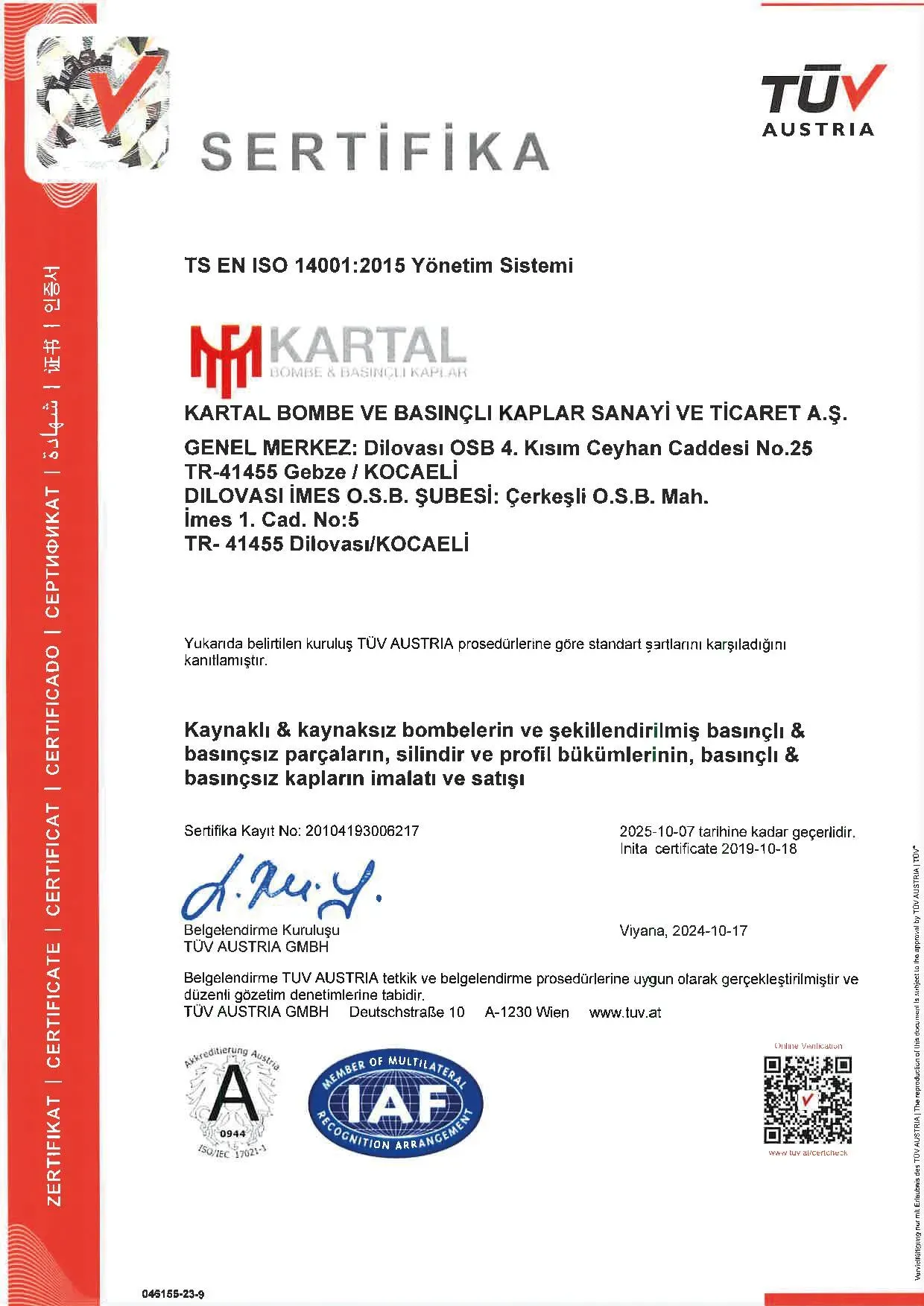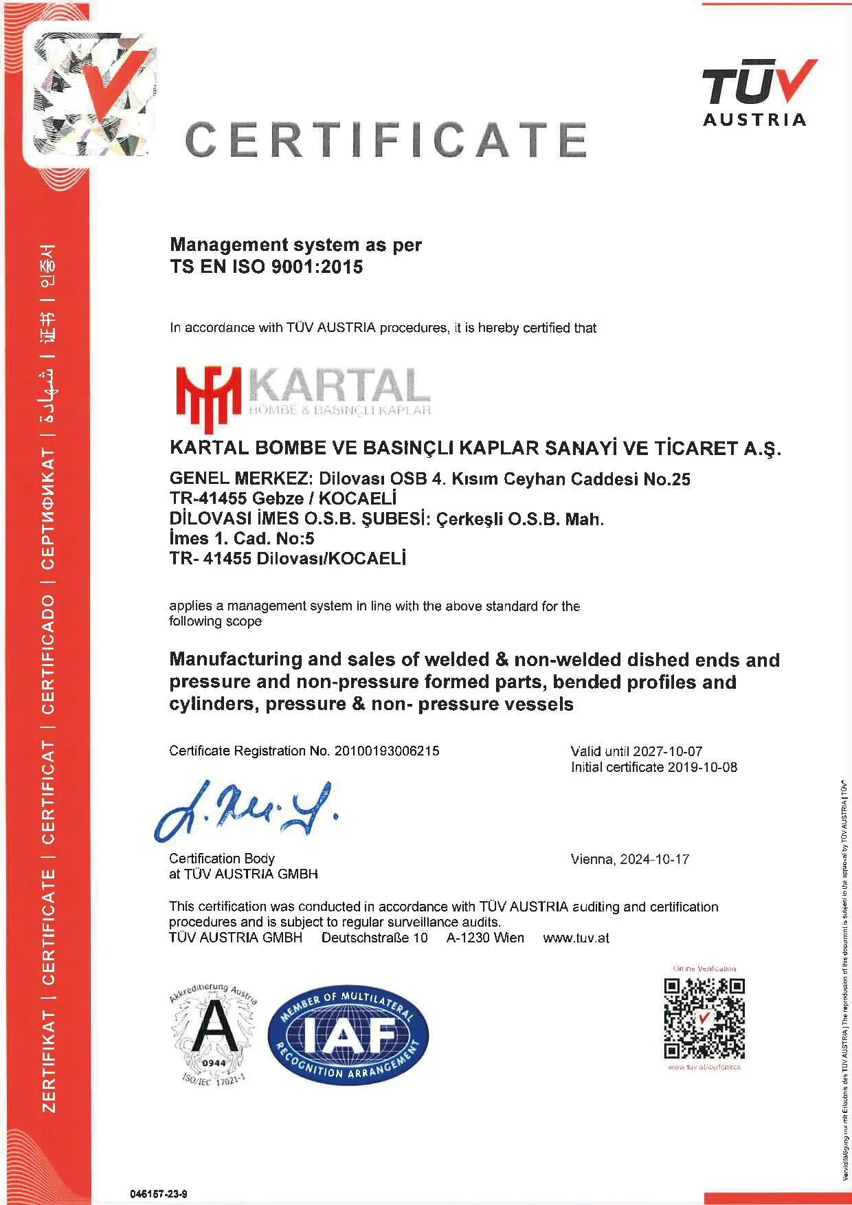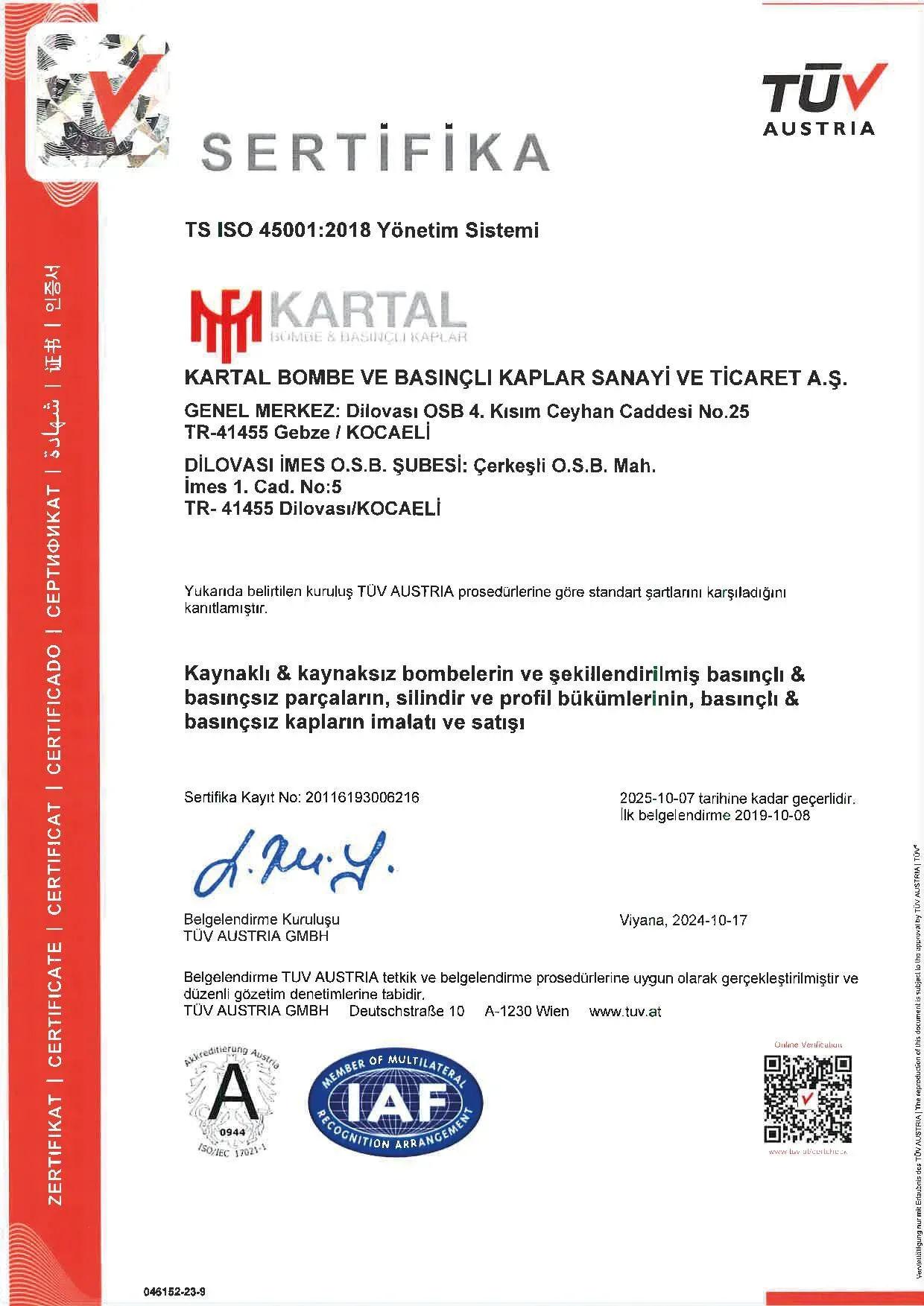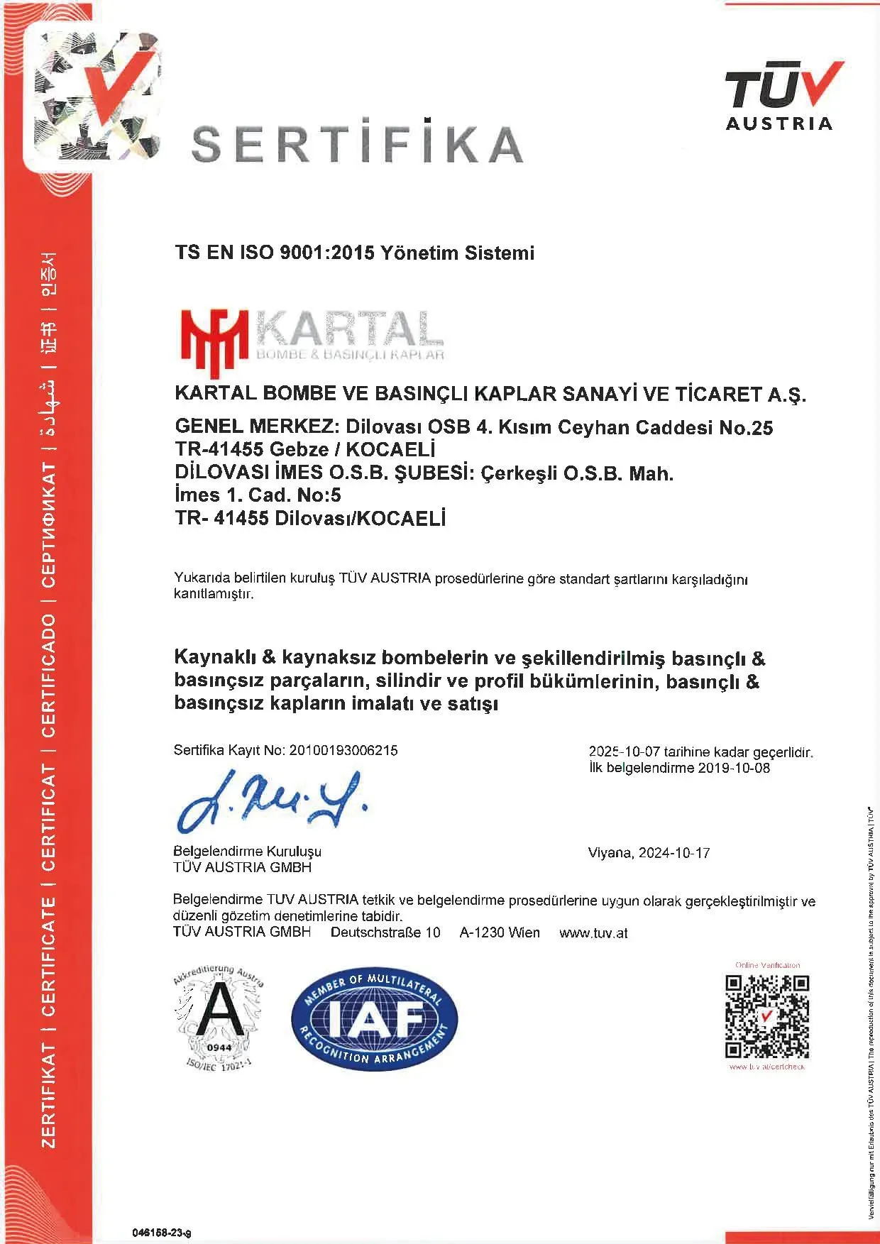 Kartal İmalat, sahip olduğu kalite belgeleri ile küresel pazarda güvenilir bir marka olmaya devam etmektedir.