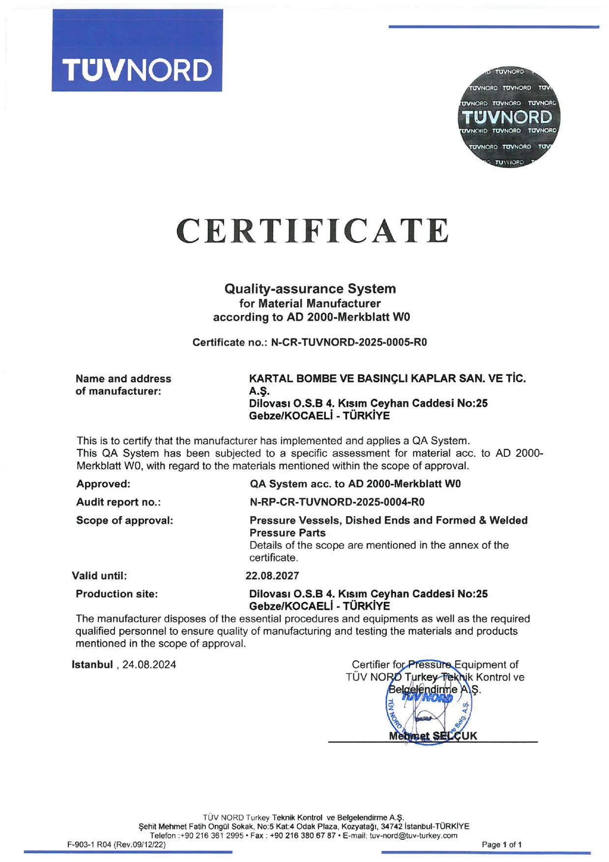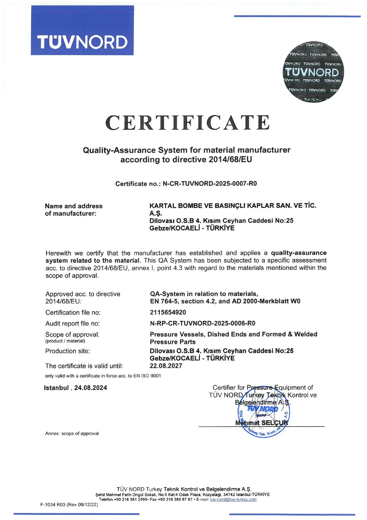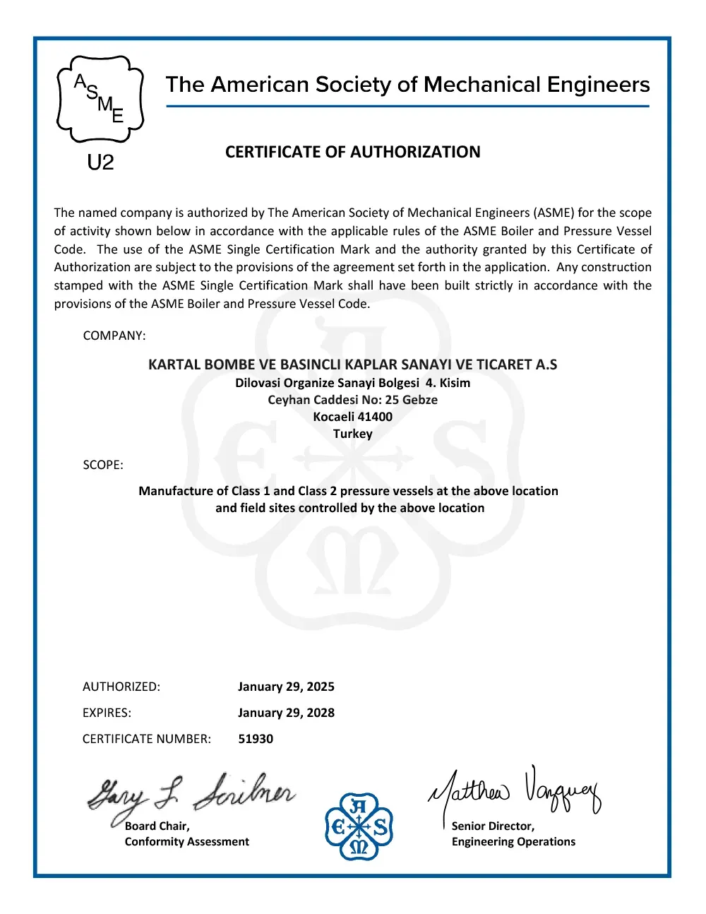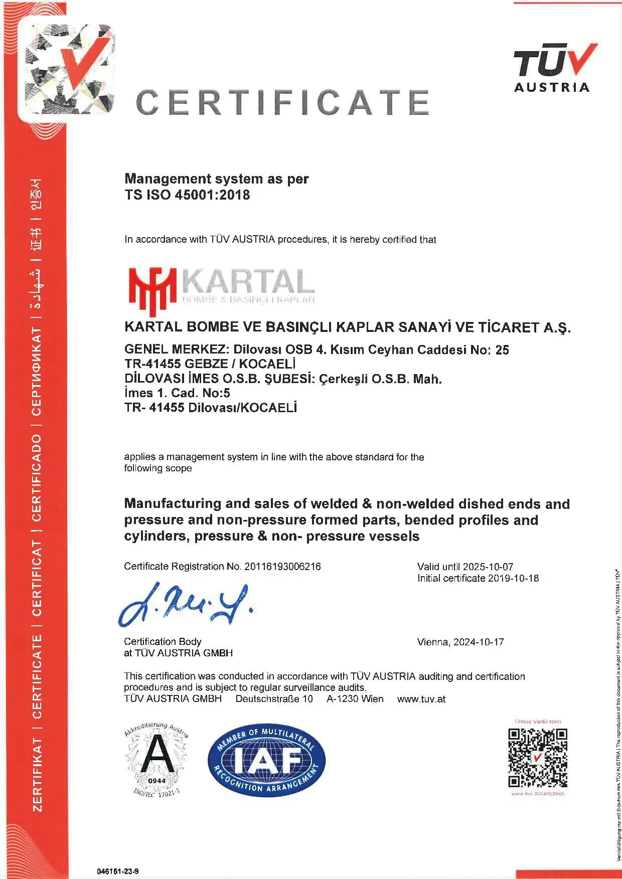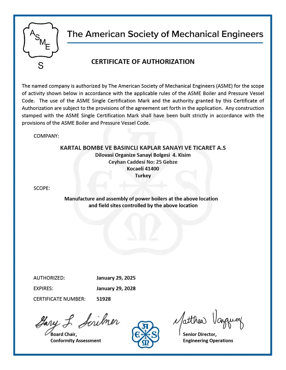 Kartal İmalat, sahip olduğu kalite belgeleri ile küresel pazarda güvenilir bir marka olmaya devam etmektedir.